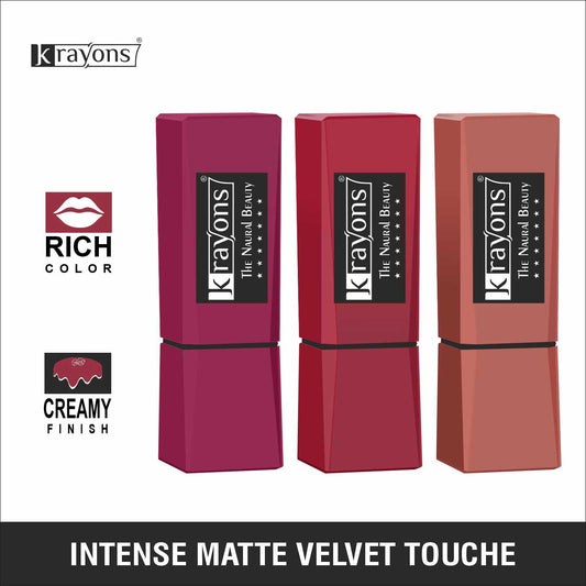 Krayons Intense Matte Lipstick, Waterproof, Longlasting, Rose Red, Scarlet Red, Nude Beige, 3.5gm Each (Pack of 3)