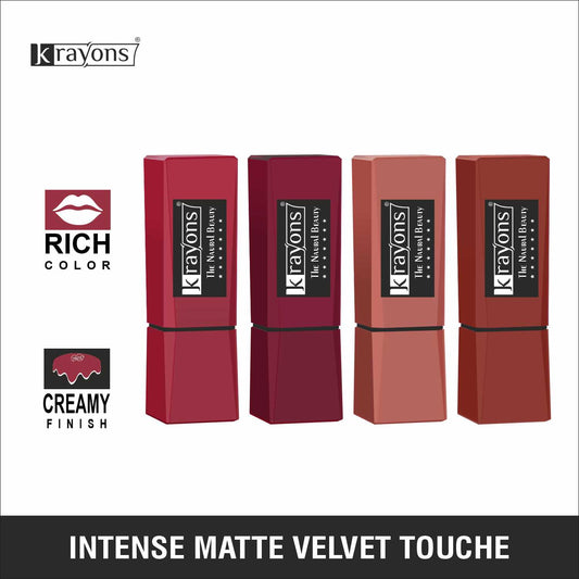 Krayons Intense Matte Lipstick, Waterproof, Longlasting, Rose Red, Scarlet Red, Cherry Maroon, Chocolate Caramel, 3.5gm Each (Pack of 4)