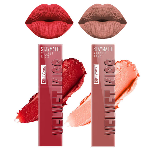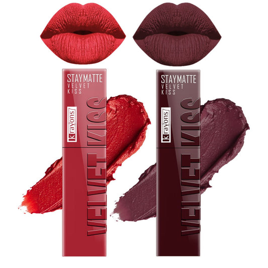 Krayons Velvet Kiss Liquid Lipstick |12hrs long stay|Intense Color Payoff | Weightless Matte Finish | Smudgeproof & Transferproof Lipstick for Women,Lipstick Combo Pack| Scarlet Red,Burnt Maroon,7 ml- PACK OF 2