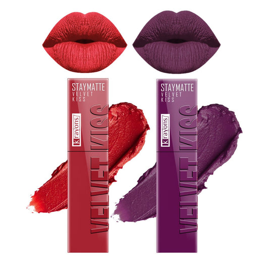 Krayons Velvet Kiss Liquid Lipstick |12hrs long stay|Intense Color Payoff | Weightless Matte Finish | Smudgeproof & Transferproof Lipstick for Women,Lipstick Combo Pack| Scarlet Red,Orchid Love,7 ml- PACK OF 2