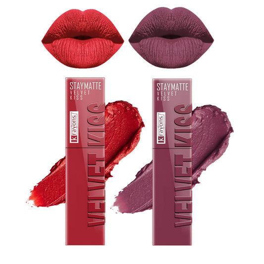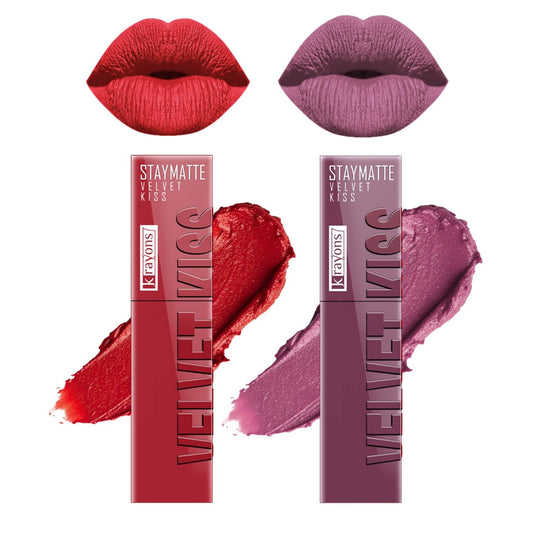 Krayons Velvet Kiss Liquid Lipstick |12hrs long stay|Intense Color Payoff | Weightless Matte Finish | Smudgeproof & Transferproof Lipstick for Women,Lipstick Combo Pack| Scarlet Red,Dusty Mauve,7 ml- PACK OF 2