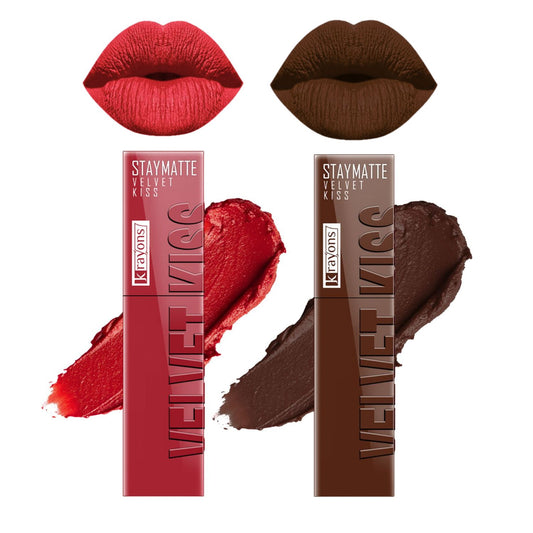 Krayons Velvet Kiss Liquid Lipstick |12hrs long stay|Intense Color Payoff | Weightless Matte Finish | Smudgeproof & Transferproof Lipstick for Women,Lipstick Combo Pack| Scarlet Red,Dark Chocolate,7 ml- PACK OF 2