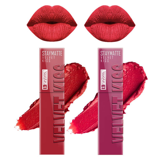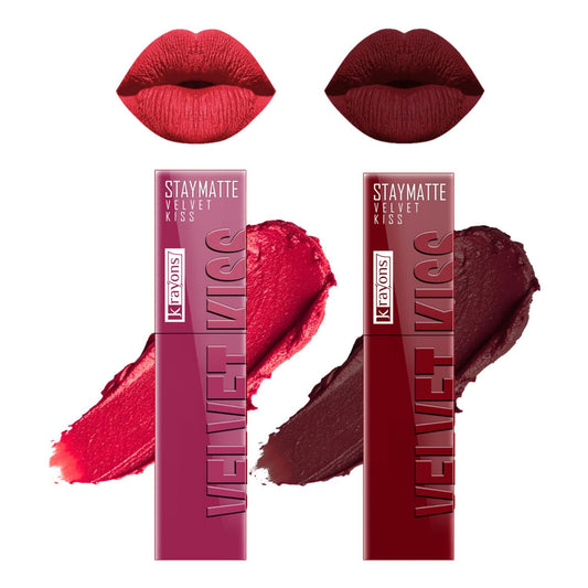 Krayons Velvet Kiss Liquid Lipstick |12hrs long stay|Intense Color Payoff | Weightless Matte Finish | Smudgeproof & Transferproof Lipstick for Women,Lipstick Combo Pack| Pink Punch,Ruby Red.7 ml- PACK OF 2