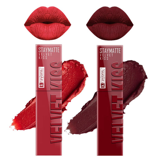 Krayons Velvet Kiss Liquid Lipstick |12hrs long stay|Intense Color Payoff | Weightless Matte Finish | Smudgeproof & Transferproof Lipstick for Women,Lipstick Combo Pack| Wow Maroon,Ruby Red.7 ml- PACK OF 2