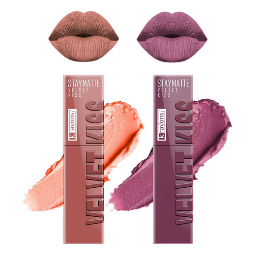 Krayons Velvet Kiss Liquid Lipstick |12hrs long stay|Intense Color Payoff | Weightless Matte Finish | Smudgeproof & Transferproof Lipstick for Women,Lipstick Combo Pack| Wow Maroon,Caramel Candy.7 ml- PACK OF 2
