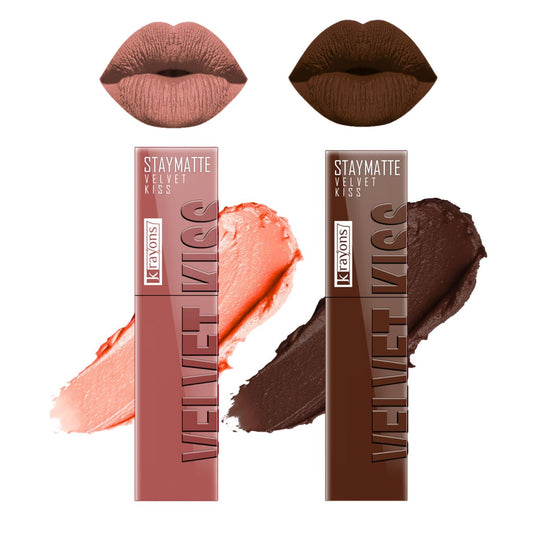 Krayons Velvet Kiss Liquid Lipstick |12hrs long stay|Intense Color Payoff | Weightless Matte Finish | Smudgeproof & Transferproof Lipstick for Women,Lipstick Combo Pack| Sheer Nude,Dark Chocolate,7 ml- PACK OF 2