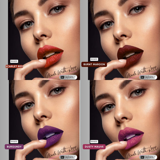 Krayons Velvet Kiss Liquid Lipstick |12hrs long stay|Intense Color Payoff | Weightless Matte Finish | Smudgeproof & Transferproof Lipstick for Women,Lipstick Combo Pack| Scarlet Red,Burnt Maroon,Burgundy,Dusty Mauve,14ml- PACK OF 4