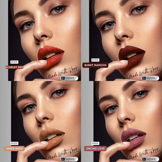 Krayons Velvet Kiss Liquid Lipstick |12hrs long stay|Intense Color Payoff | Weightless Matte Finish | Smudgeproof & Transferproof Lipstick for Women,Lipstick Combo Pack| Scarlet Red,Burnt Maroon,Sheer Nude,Orchid Love,14ml- PACK OF 4
