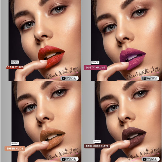 Krayons Velvet Kiss Liquid Lipstick |12hrs long stay|Intense Color Payoff | Weightless Matte Finish | Smudgeproof & Transferproof Lipstick for Women,Lipstick Combo Pack| Scarlet Red,Dusty Mauve,Sheer Nude,Dark Chocolate,14ml- PACK OF 4