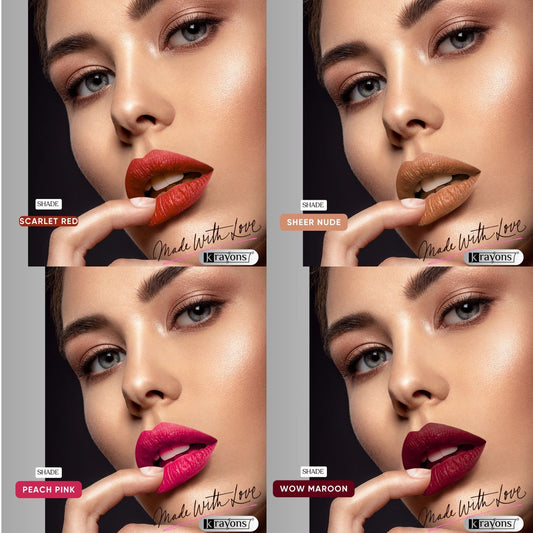 Krayons Velvet Kiss Liquid Lipstick |12hrs long stay|Intense Color Payoff | Weightless Matte Finish | Smudgeproof & Transferproof Lipstick for Women,Lipstick Combo Pack| Scarlet Red,Sheer Nude,Peach Pink,Wow Maroon,14ml- PACK OF 4