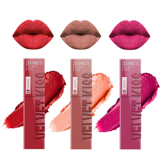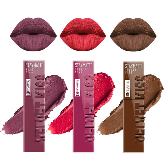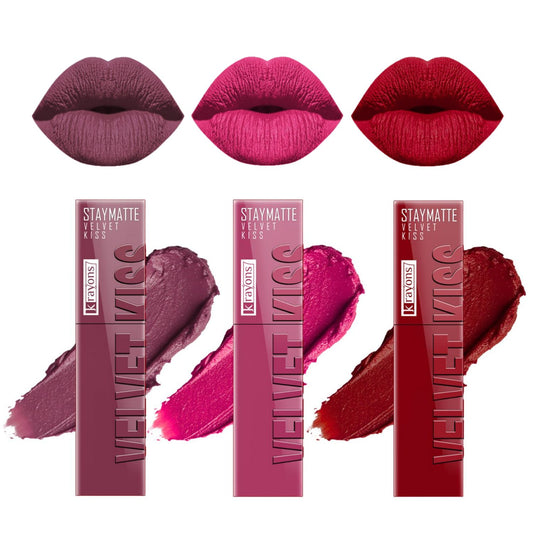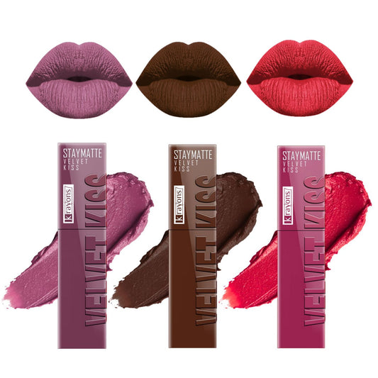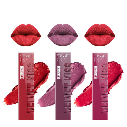 Krayons Velvet Kiss Liquid Lipstick |12hrs long stay|Intense Color Payoff | Weightless Matte Finish | Smudgeproof & Transferproof Lipstick for Women,Lipstick Combo Pack| Dusty Mauve,Pink Punch,Ruby Red,10.5 ml- PACK OF 3