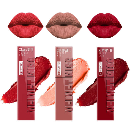 Krayons Velvet Kiss Liquid Lipstick |12hrs long stay|Intense Color Payoff | Weightless Matte Finish | Smudgeproof & Transferproof Lipstick for Women,Lipstick Combo Pack| Scarlet Red,Sheer Nude,Ruby Red,10.5 ml- PACK OF 3