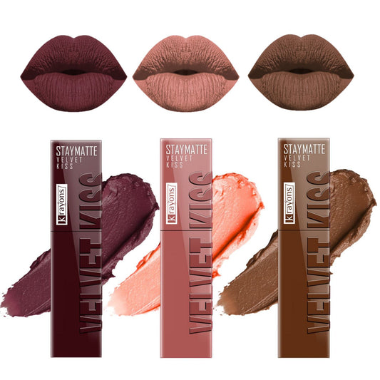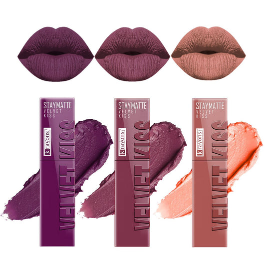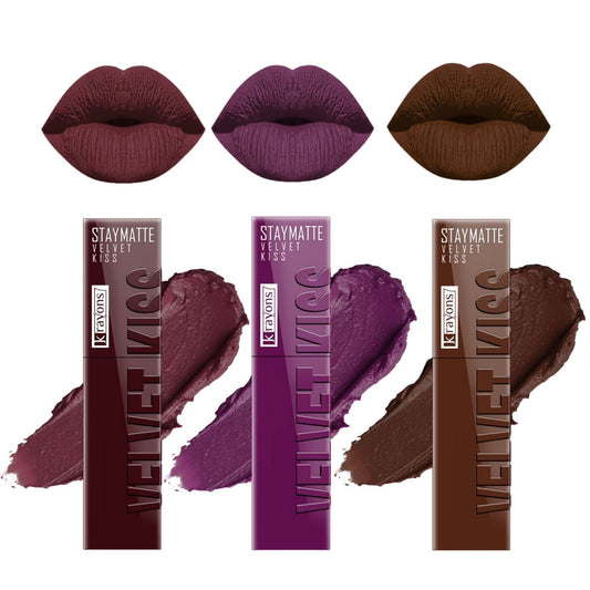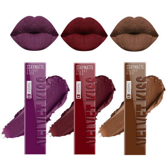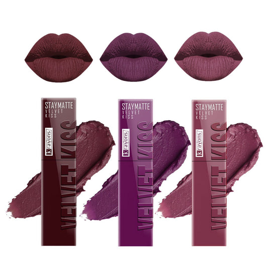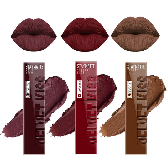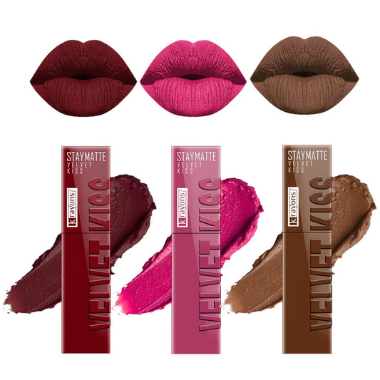 Krayons Velvet Kiss Liquid Lipstick |12hrs long stay|Intense Color Payoff | Weightless Matte Finish | Smudgeproof & Transferproof Lipstick for Women,Lipstick Combo Pack| Burnt Maroon,Burgundy,Dark Chocolate,10.5 ml- PACK OF 3