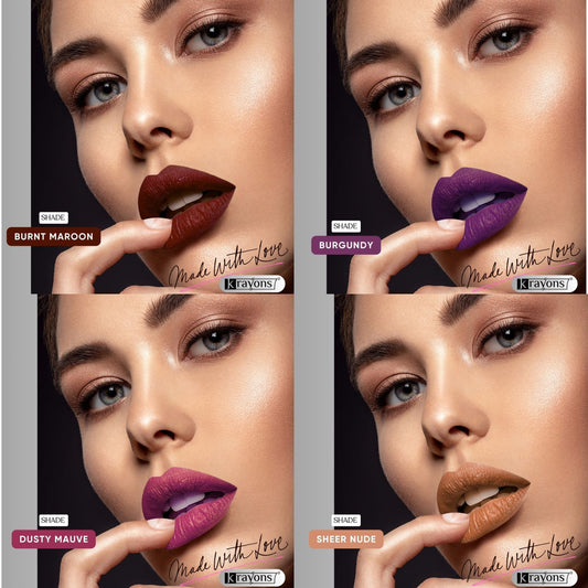 Krayons Velvet Kiss Liquid Lipstick |12hrs long stay|Intense Color Payoff | Weightless Matte Finish | Smudgeproof & Transferproof Lipstick for Women,Lipstick Combo Pack| Burnt Maroon,Burgundy,Dusty Mauve,Sheer Nude,14ml- PACK OF 4