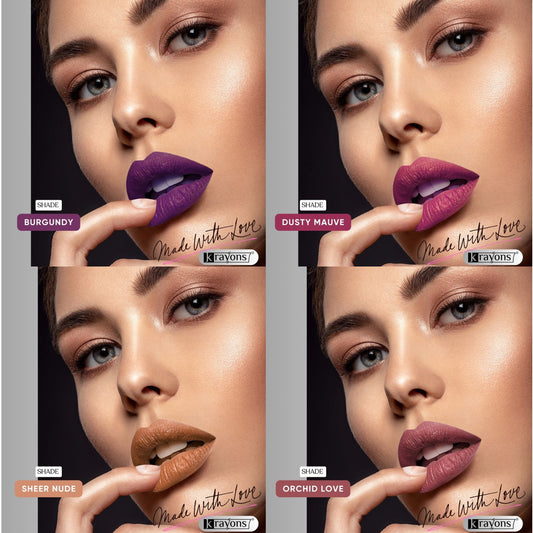 Krayons Velvet Kiss Liquid Lipstick |12hrs long stay|Intense Color Payoff | Weightless Matte Finish | Smudgeproof & Transferproof Lipstick for Women,Lipstick Combo Pack| Burgundy,Dusty Mauve,Sheer Nude,Orchid Love,14ml- PACK OF 4