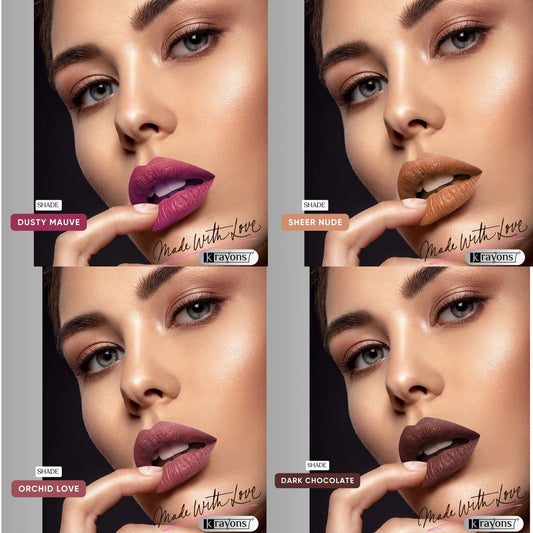 Krayons Velvet Kiss Liquid Lipstick |12hrs long stay|Intense Color Payoff | Weightless Matte Finish | Smudgeproof & Transferproof Lipstick for Women,Lipstick Combo Pack| Dusty Mauve,Sheer Nude,Orchid Love,Dark Chocolate,14ml- PACK OF 4
