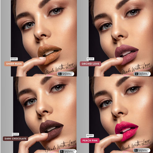 Krayons Velvet Kiss Liquid Lipstick |12hrs long stay|Intense Color Payoff | Weightless Matte Finish | Smudgeproof & Transferproof Lipstick for Women,Lipstick Combo Pack| Sheer Nude,Orchid Love,Dark Chocolate,Peach Pink,14ml- PACK OF 4