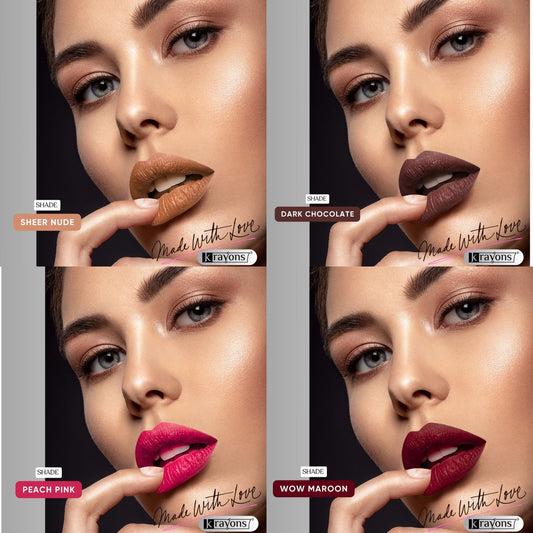 Krayons Velvet Kiss Liquid Lipstick |12hrs long stay|Intense Color Payoff | Weightless Matte Finish | Smudgeproof & Transferproof Lipstick for Women,Lipstick Combo Pack| Sheer Nude,Dark Chocolate,Peach Pink,Wow Maroon,14ml- PACK OF 4