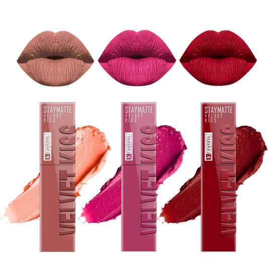 Krayons Velvet Kiss Liquid Lipstick |12hrs long stay|Intense Color Payoff | Weightless Matte Finish | Smudgeproof & Transferproof Lipstick for Women,Lipstick Combo Pack| Sheer Nude,Pink Punch,Ruby Red,10.5 ml- PACK OF 3