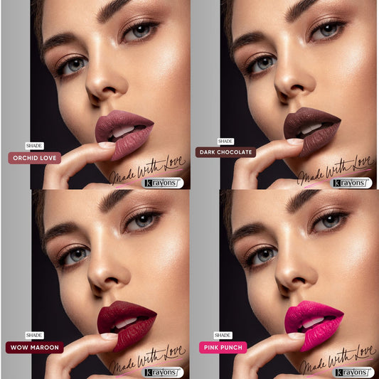 Krayons Velvet Kiss Liquid Lipstick |12hrs long stay|Intense Color Payoff | Weightless Matte Finish | Smudgeproof & Transferproof Lipstick for Women,Lipstick Combo Pack| Orchid Love,Dark Chocolate,Wow Maroon,Pink Punch,14ml- PACK OF 4