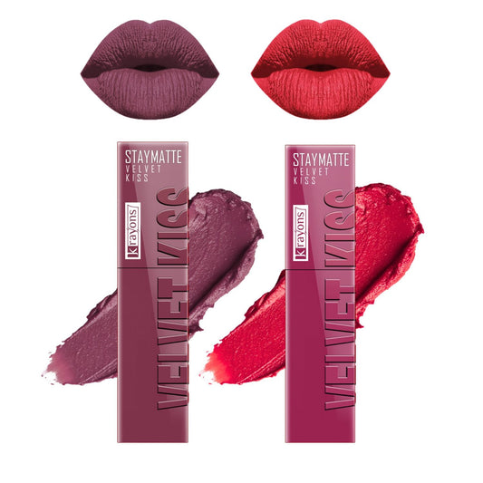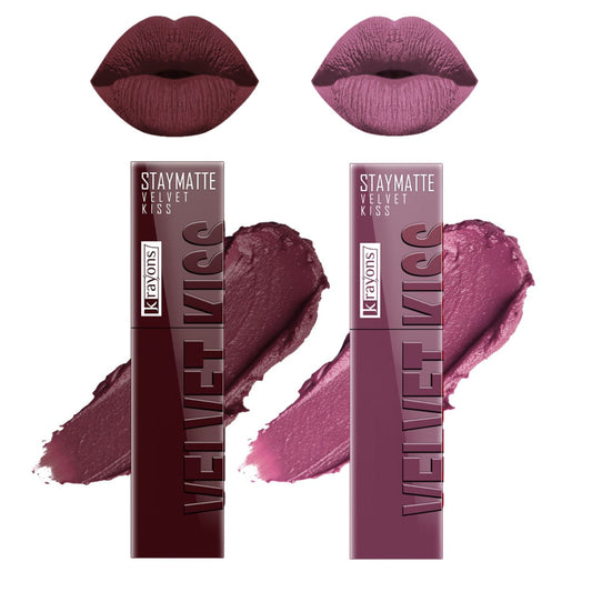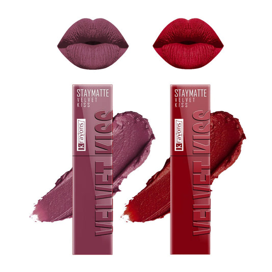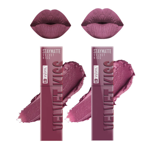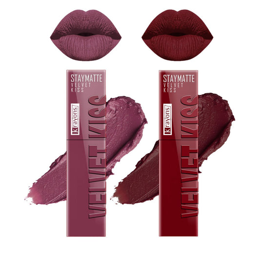 Krayons Velvet Kiss Liquid Lipstick |12hrs long stay|Intense Color Payoff | Weightless Matte Finish | Smudgeproof & Transferproof Lipstick for Women,Lipstick Combo Pack| Dusty Mauve,Ruby Red,7 ml- PACK OF 2