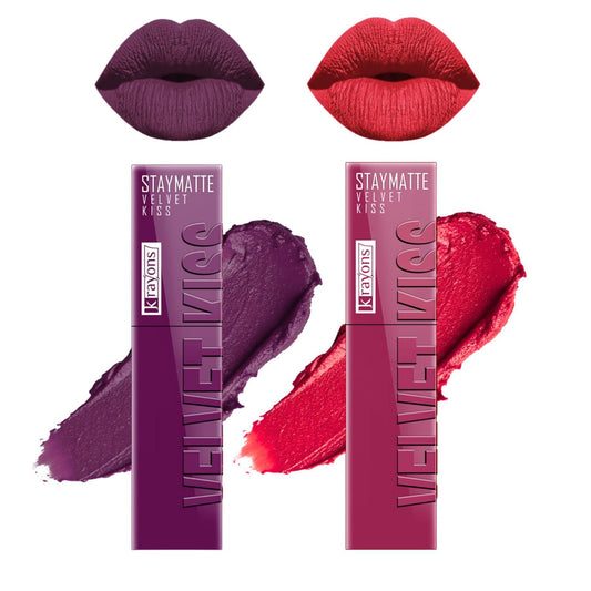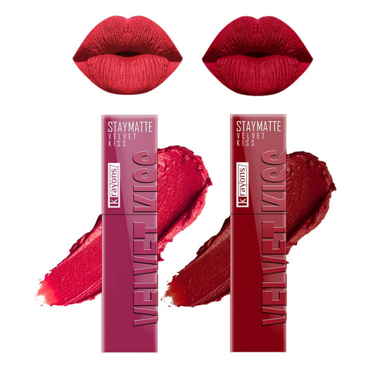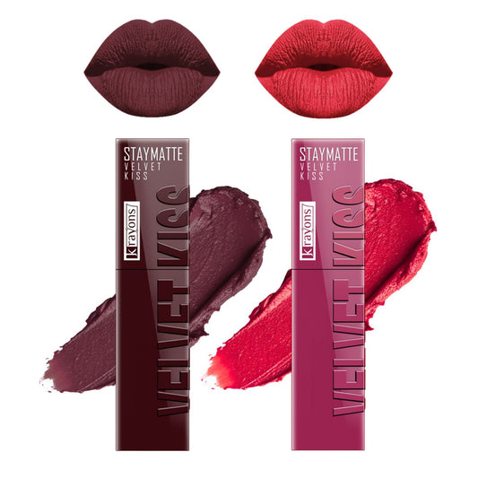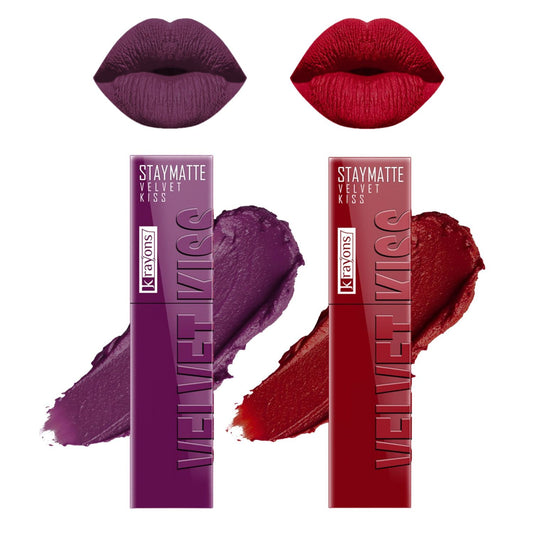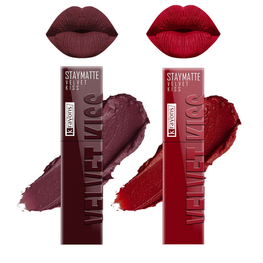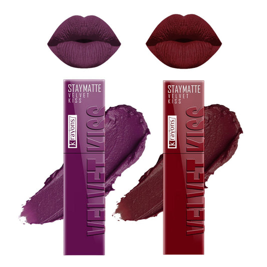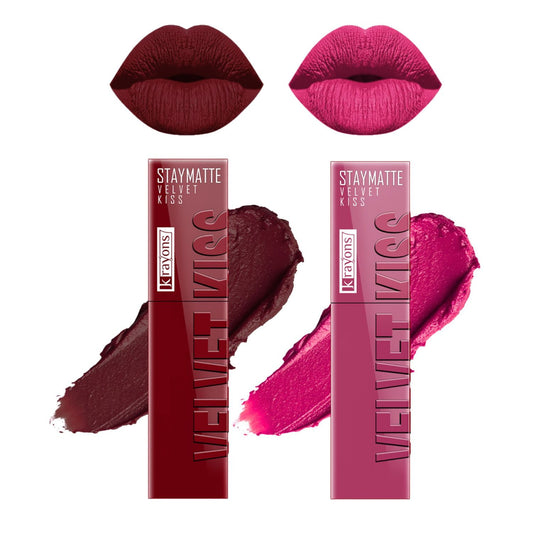 Krayons Velvet Kiss Liquid Lipstick |12hrs long stay|Intense Color Payoff | Weightless Matte Finish | Smudgeproof & Transferproof Lipstick for Women,Lipstick Combo Pack| Wow Maroon,Ruby Red.7 ml- PACK OF 2