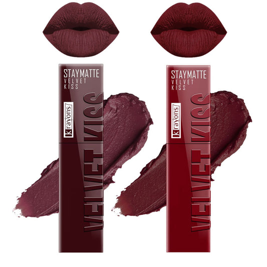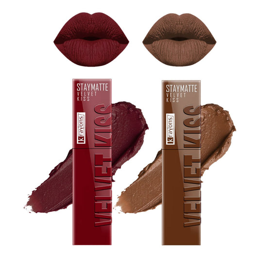 Krayons Velvet Kiss Liquid Lipstick |12hrs long stay|Intense Color Payoff | Weightless Matte Finish | Smudgeproof & Transferproof Lipstick for Women,Lipstick Combo Pack| Burgundy,Dark Chocolate,7 ml- PACK OF 2