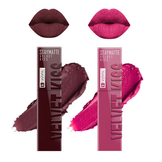 Krayons Velvet Kiss Liquid Lipstick |12hrs long stay|Intense Color Payoff | Weightless Matte Finish | Smudgeproof & Transferproof Lipstick for Women,Lipstick Combo Pack| Wow Maroon,Pink Punch,7 ml- PACK OF 2