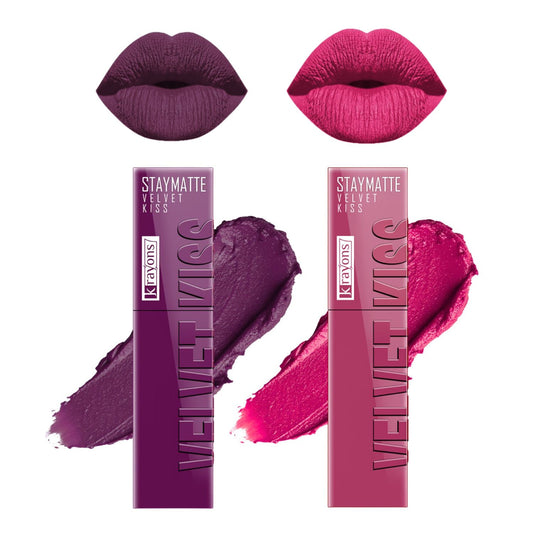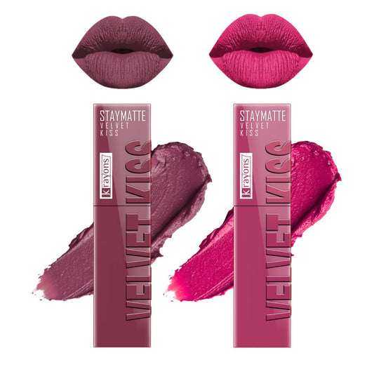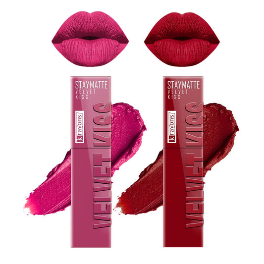 Krayons Velvet Kiss Liquid Lipstick |12hrs long stay|Intense Color Payoff | Weightless Matte Finish | Smudgeproof & Transferproof Lipstick for Women,Lipstick Combo Pack| Pink Punch,Ruby Red.7 ml- PACK OF 2