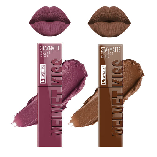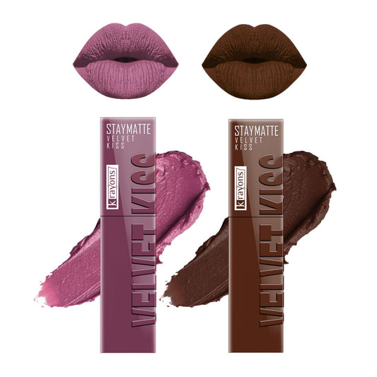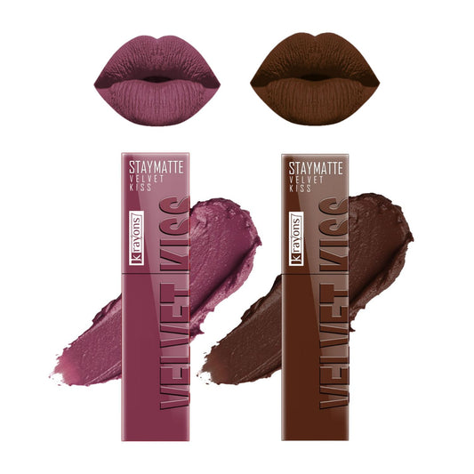 Krayons Velvet Kiss Liquid Lipstick |12hrs long stay|Intense Color Payoff | Weightless Matte Finish | Smudgeproof & Transferproof Lipstick for Women,Lipstick Combo Pack| Dusty Mauve,Dark Chocolate,7 ml- PACK OF 2