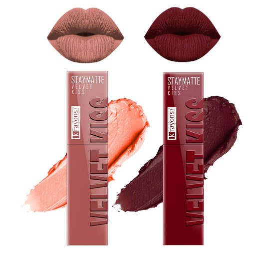 Krayons Velvet Kiss Liquid Lipstick |12hrs long stay|Intense Color Payoff | Weightless Matte Finish | Smudgeproof & Transferproof Lipstick for Women,Lipstick Combo Pack| Burnt Maroon,Ruby Red,7 ml- PACK OF 2