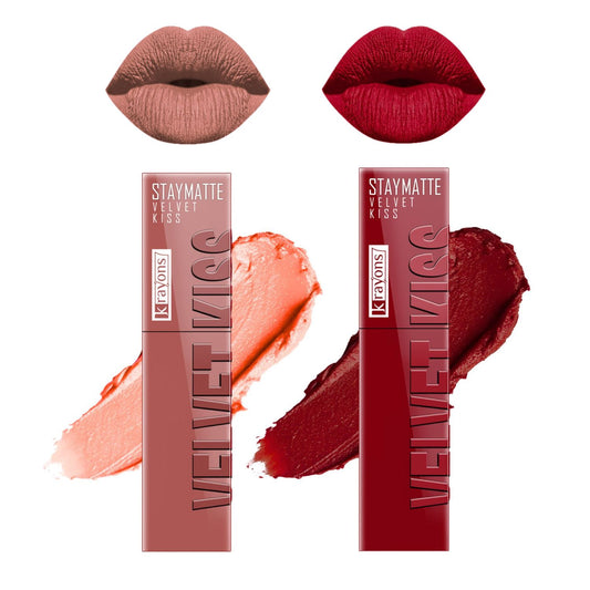 Krayons Velvet Kiss Liquid Lipstick |12hrs long stay|Intense Color Payoff | Weightless Matte Finish | Smudgeproof & Transferproof Lipstick for Women,Lipstick Combo Pack| Sheer Nude,Ruby Red.7 ml- PACK OF 2