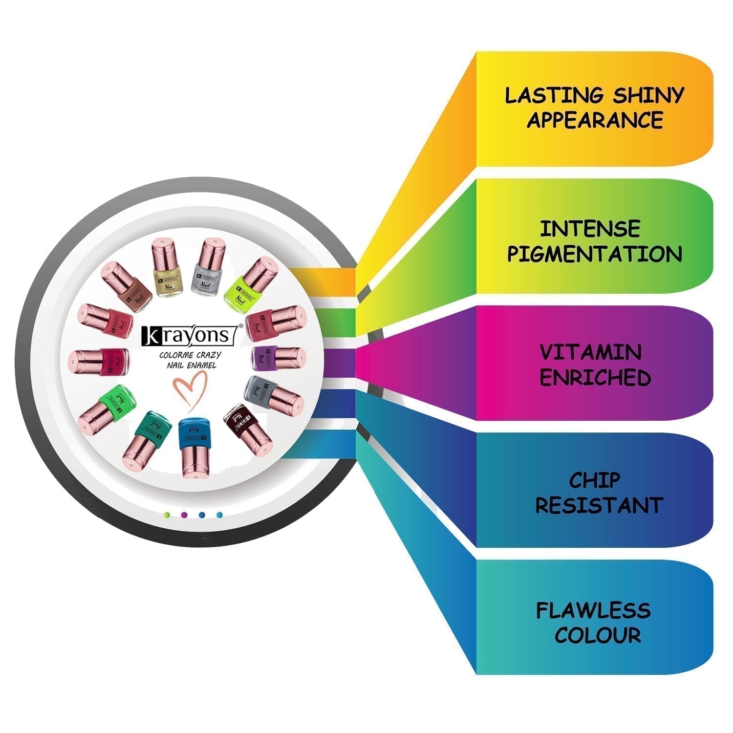 Krayons nail paints are must whether you are partying out at disc or hanging out with friends.Why? Because pampering yourself is important with these exoctic shades for getting selfies and lots of likes on Facebook and instagram.Super shiny effect of Krayons nail paints lasts longer, so nails will look just as good next weekend as they do this weekend.Get your hands on these nail paints to rock the look on your fingers.Top your tips with two to three coats of these quick drying coloured polish for perfect looking nails.Swiping on these nail polish is like the day at the spa for your nails. Formula is loaded with vitamin e to nourish dry nails.Its unique formula allows nail to breathe right through two coats with its eye catching trendy shades which will look lit during your favourite memorable moments.