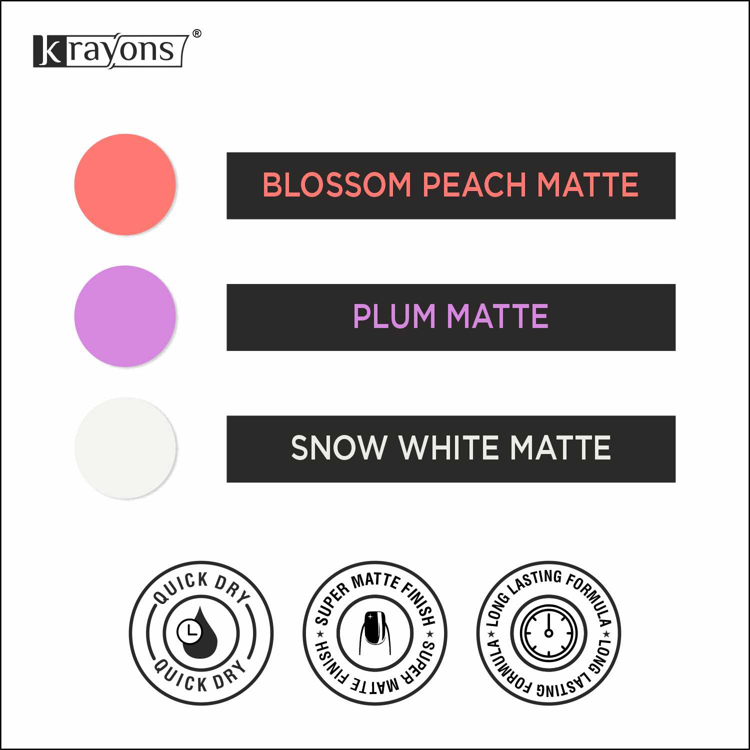 Krayons Cute Super Matte Finish Nail Enamel, Quick Dry, LongLasting, Blossom Peach, Plum Matte, Snow White, 6ml Each (Pack of 3)
