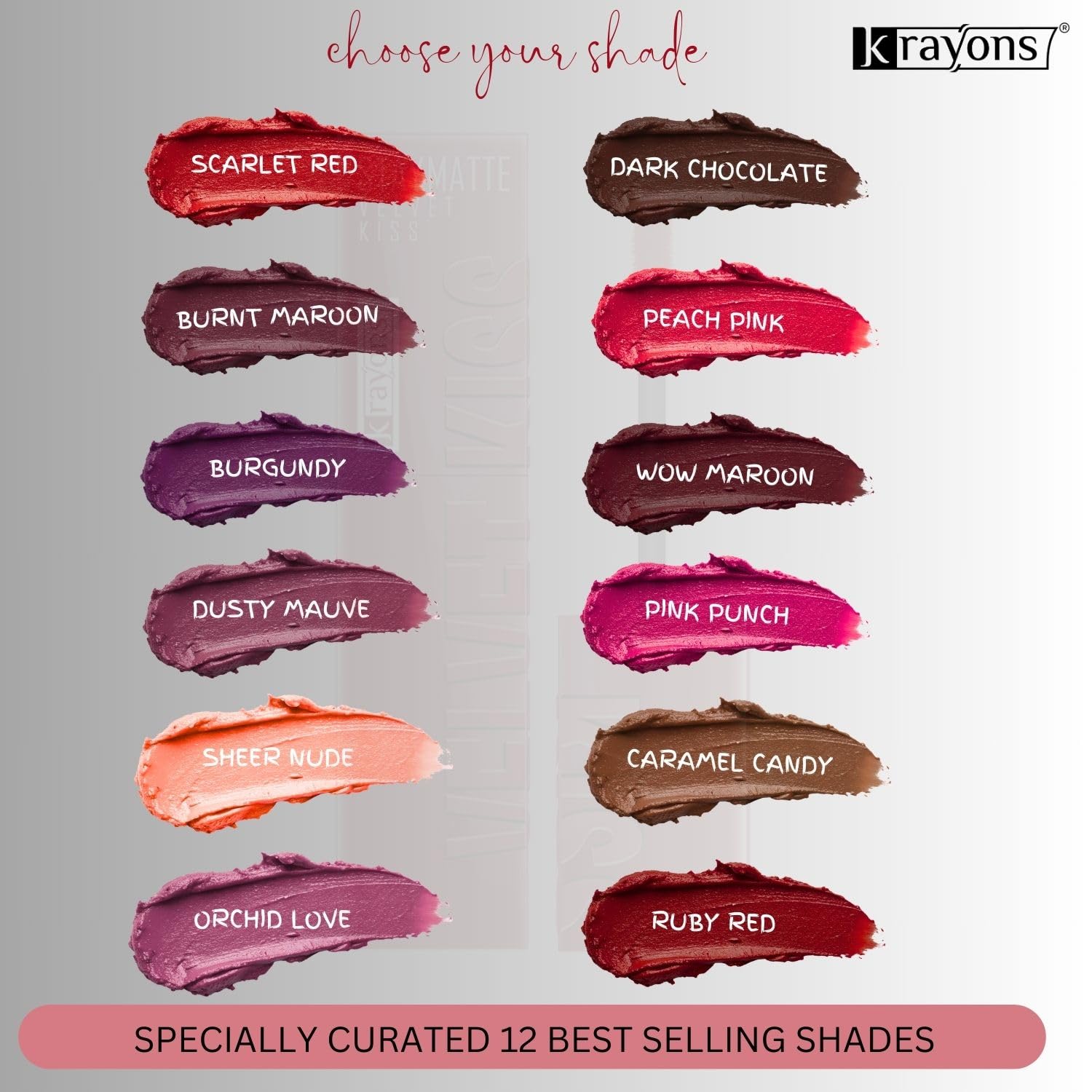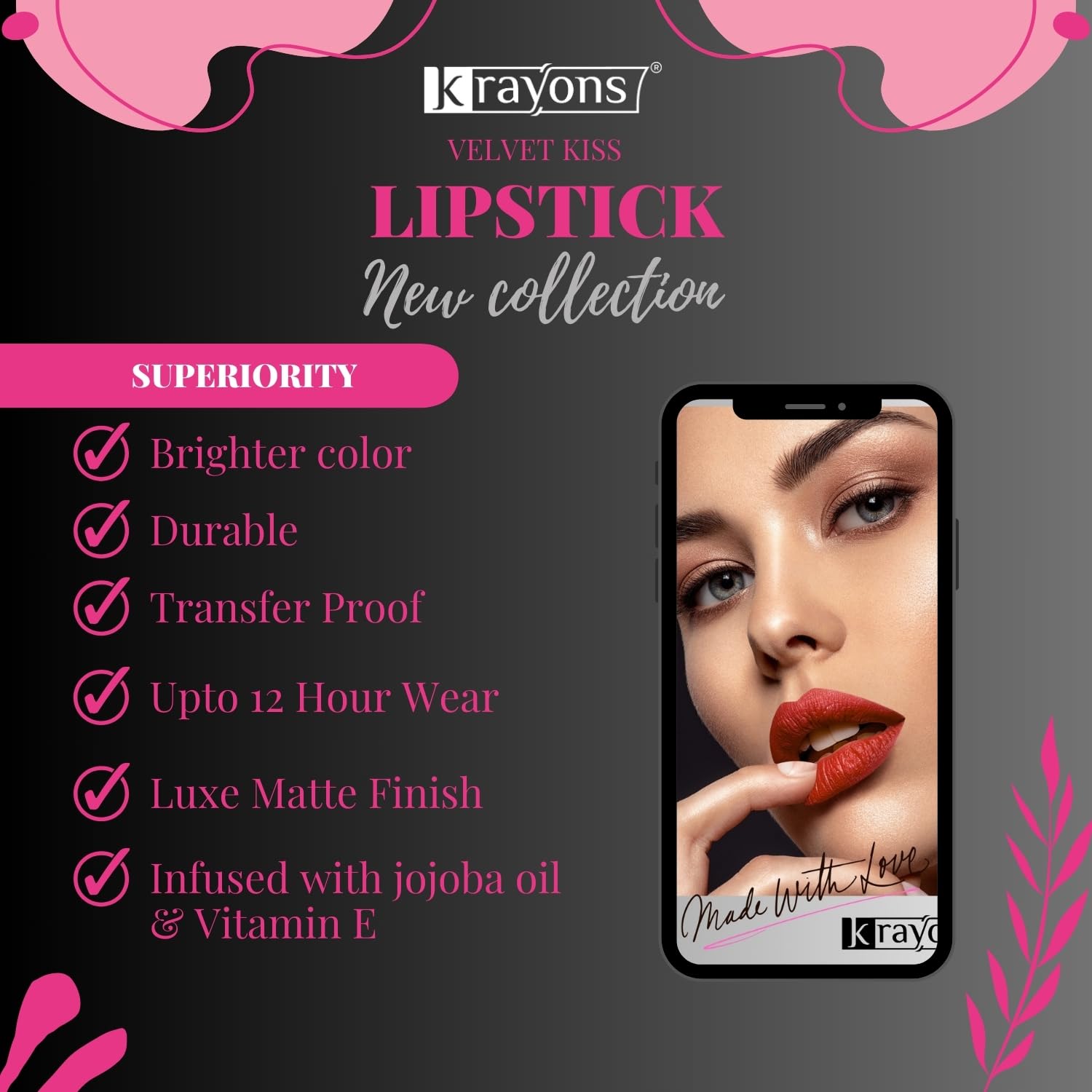 - Vibrant, Rich Colors: From subtle nude shades to striking reds, Krayons Velvet kiss Matte Lipstick offers a wide range of colors to suit every mood, outfit, and occasion.