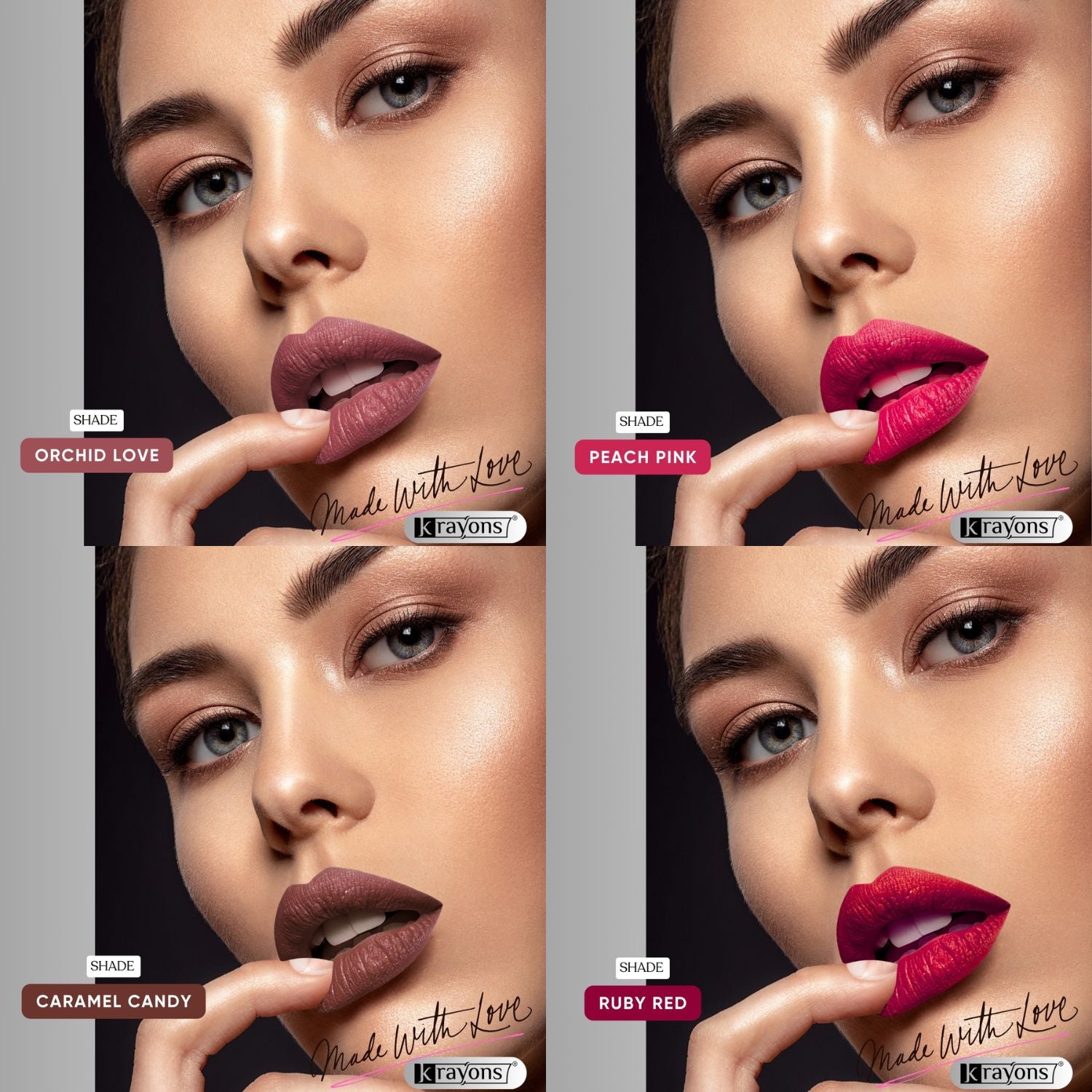 Krayons Velvet Kiss Liquid Lipstick |12hrs long stay|Intense Color Payoff | Weightless Matte Finish | Smudgeproof & Transferproof Lipstick for Women,Lipstick Combo Pack| Orchid Love,Peach Pink,Caramel Candy,Ruby Red,14ml- PACK OF 4